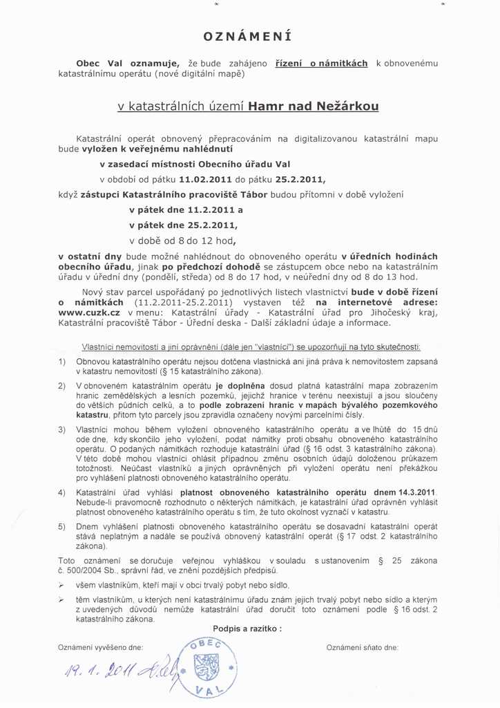 Oznámení o řízení o námitkách v k.ú. Hamr nad Nežárkou